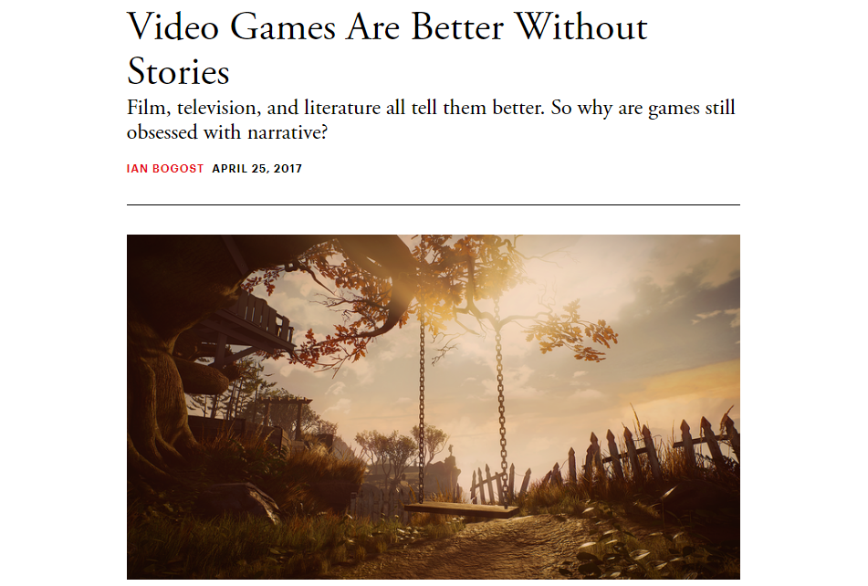 回归本源 在 2017 年,身为游戏开发者、评论者、学者以及《大西洋月刊》的特约作者 Ian Bogost 因一篇名为《游戏没有剧情会更好(Video Games Are Better Without Stories)》的文章而在业内引起关注。他在文中表明,游戏所讲述的故事永远不会如电影、电视剧和书籍中的好,所以为何还要大费周章去做呢? 看到这儿,各位可能立刻想要否定他的观点,但如果这番言论是针对 FPS 游戏的话,我们不妨自问一下:剧情真的一直都很重要吗?还是通常只作为点缀? 文章《游戏没有剧情会更好》截图