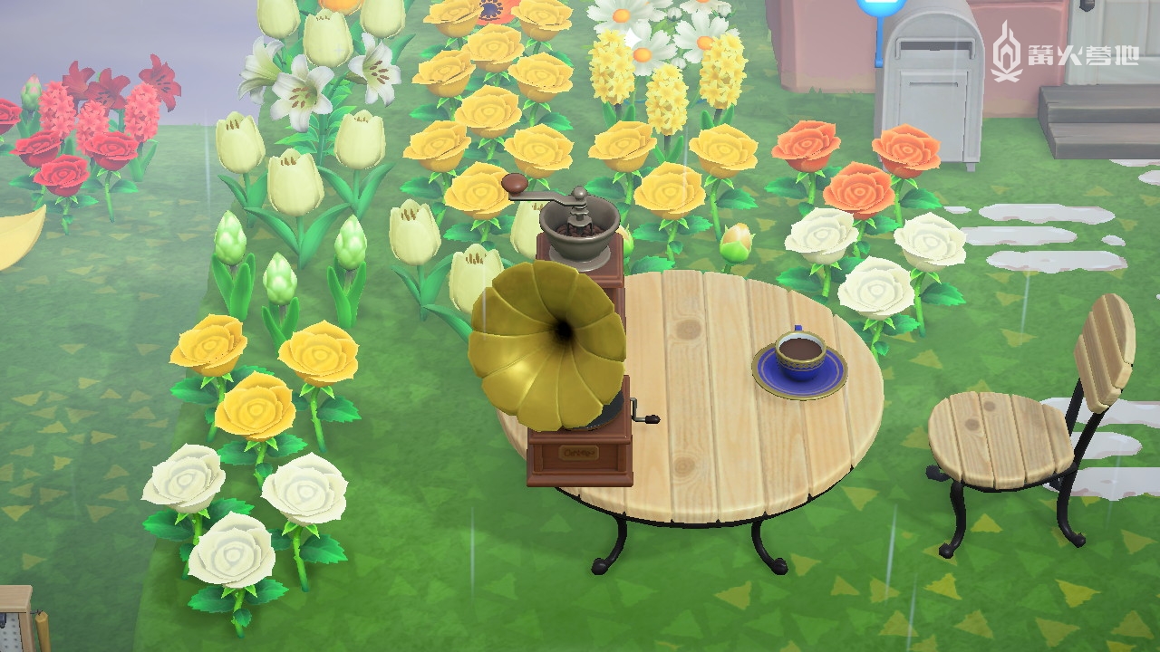 而有趣的是,在「动森」里,你几乎能够还原上面的整个过程。从无人岛的家里出发,为了要买 K.K Slider 今日特供的那张专辑,跑到老狸猫的店里剁手,然后等第二天到货之后抱着这张唱片找个你喜欢的角落坐下,把唱片添加到随便一台你已获得的播放器里,音乐缓缓响起,你在能够听到声响的距离之内种种花,钓钓鱼,有时候一听就是一个下午,一听就是一个晚上。 毫不夸张,在「动森」里听 K.K Slider 的唱片确实有一种听实体专辑的感觉。实际上,游戏的设计大可以让玩家点一下音乐图标就播放音乐,或者让玩家将音乐添加到游戏中的手机设备里,但出于设计者或是有意或是无意的想法,他并没有那么做,游戏里要求你首先得有一个能插唱片的机器,接着你还需要把这个唱片放进去,然后你才能听到这张专辑。 「动森」里的留声机