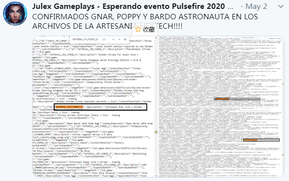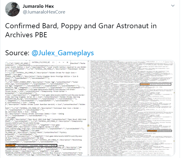 在最近的的测试服更新中,未来战士系列又推出了四款新皮肤,主角分别为:菲奥娜、卢锡安、潘森、艾克。根据拳头设计师的爆料来看,在5月份也将会推出未来战士事件活动,而这次的至臻皮肤就是卢锡安。代币数量依然为2000个,暂未公布是否能通过代币来兑换至臻点。 另外有网友发现,在测试服的更新文件包中,疑似包含了几款新宇航员皮肤。除了之前拳头曝光的宇航员巴德之外,还有两款宇航员皮肤,主角分别是波比和纳尔。 两位玩家都曾在推特上爆料关于测试服的更新文件内容(注:此信息为国外玩家爆料内容,具体内容以公告为准!):
