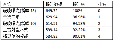 从计算结果来看,无神话的情况下,大自然的呼吸工作服防具,提升数据排名第四,提升率仅比最强的手搓套少2.4%;如果都佩戴神话上衣的情况下,工作服提升率依然排在15套防具的第四位,比最强手搓第3.84%的提升率; 【二】工作服首饰排名 人物建模一样,装备模拟变更为工作服防具,工作服特殊装备,来测试四套3件套首饰的提升率,计算结果如下: