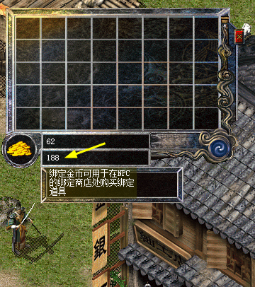 获得机制:8级前的角色,通过任何方式获得的金币都是绑定金币,在包裹中显示在绑定金币部位。 客户端显示如下图:在包裹栏新增绑定金币显示,鼠标移上去会有提示描述 新增绑定金币商店功能:
