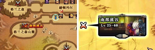 与怪物攻城一样,南部溪谷每周定时开放两次,在南部溪谷开放的时间内,洛兰之森将变成格兰之森山麓。南部溪谷入场时间为一个小时,在一个小时之中,勇士们可以凭借入场券挑战副本里的各种怪物!