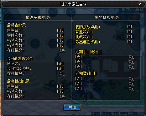 玩家还可以在各地区设置的公告栏上查看挑战战绩等(赫顿玛尔/艾尔文防线现有公告栏西海岸、天界)。每个月1号挑战者纪录初始化,同时,根据玩家挑战/胜利次数发放荣誉称号。