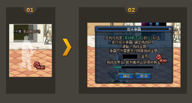 Lv30以上的角色可以发起或接受挑战。在按住ctrl键的状态下,左键点击想挑战角色,在快捷菜单中选择[挑战],在对话框中点击角色名称时,在快捷菜单中选择[挑战]。被挑战的角色必须接受挑战请求后,挑战才会开始,发起或者接受挑战的当事人角色,如果离开队伍, 那么挑战不会开始。接受挑战邀请时,若对方是队伍,将告知玩家对方有几名队员。若接受挑战,会给队伍成员8秒的犹豫时间,所有队员会收到提示,而且必须所有队员同意,挑战才会开始,8秒内不选择接受/拒绝的话,默认为拒绝。可以发起挑战的地区仅限于城镇,并且需要在相同的区域才能发起挑战。(不符合条件、或位于无法移动的地区时,不能发起挑战)。单个角色或者队伍成员中,挑战的角色之间Lv差异在Lv20以上时,不能发起挑战。发起挑战时可以押金币,范围在0-50万之间。多人挑战时每人押相同数量的金币,由胜利的一方平分全部金币。挑战结束后,记录挑战战绩(胜者获得3点挑战点数,负者获得1点,挑战点数保留1个月,每个月1号初始化的同时,用邮件发放荣誉称号)。玩家进行的挑战越多,玩家的头像名在街头争霸的队员确认时背景颜色越红。装备强化统一调整为+0,宠物属性有效,可以使用宠物主动技能,可以使用消耗品,首饰属性有效,但是一些特殊效果不再适用,不可以使用人偶(可以使用狂龙之吼),勇者系列装备的套装属性无效。伤害判定并非采用PK场的伤害判定,而是采用了玩家在副本中的伤害判定,并且可以使用EX系列技能。虚弱在100%以上时才能发起挑战。胜利者回到城镇时,HP, MP为挑战结束后剩下的HP、MP,然后在城镇中慢慢回血。失败者的HP, MP变为1%(无胜败时,双方HP,MP也会变为1%,并且双方均会被记录为负场)。如果出现掉线的情况,则会通过邮件返还双方所押金币。相同的角色之间,每天只能挑战5次(队员不算,只有1:1和队长计数)。魔王的契约中,城镇恢复疲劳项适用、但地下城中自动回血项不适用。怪物攻城时无法进行街头争霸。